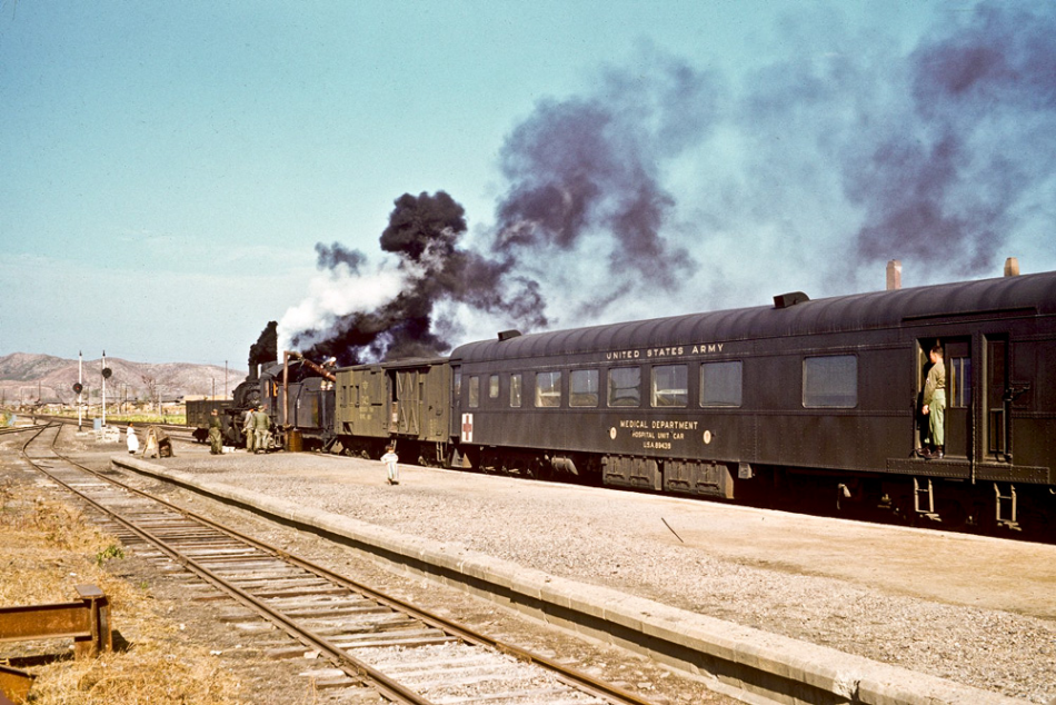 전투중 부상당한 유엔군을 765 병원열차에 싣고있다.
