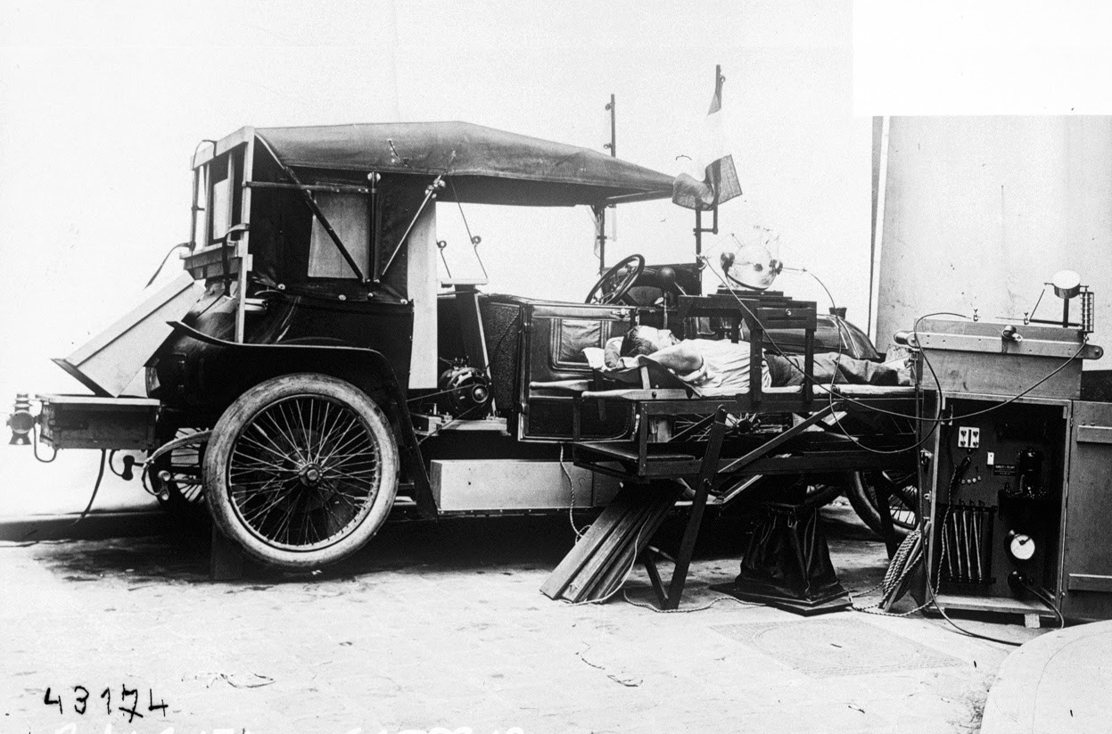 A patient is examined in a mobile radiology lab, belonging to the French Army, ca. 1914. (Bibliotheque nationale de France)