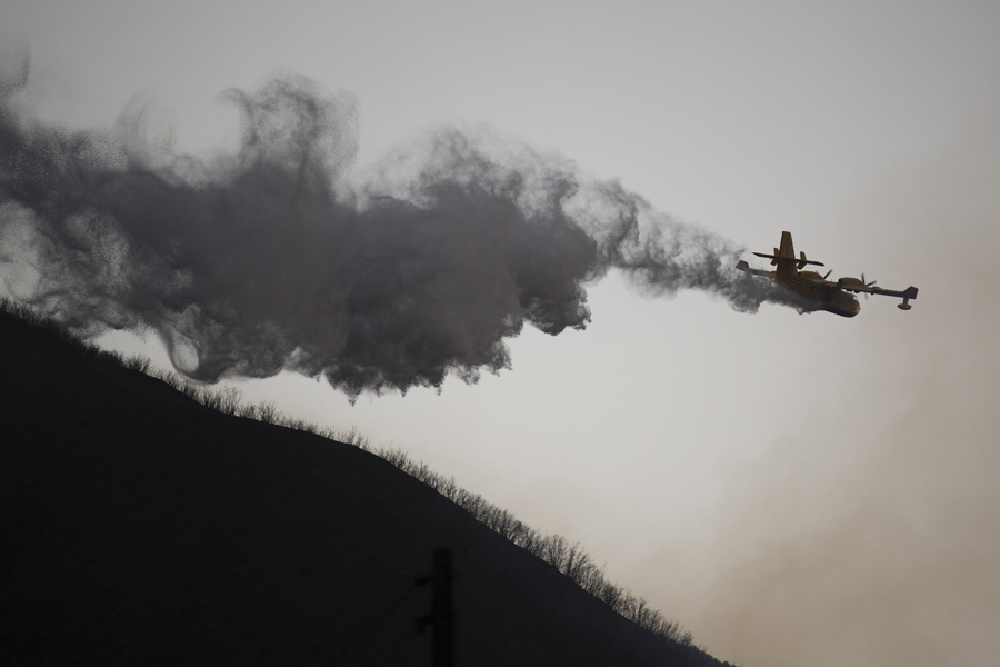 • A CL-415 SuperScooper firefighting aircraft, newly arrived to the Los Angeles County Fire Department on lease from the government of Quebec, drops water on the Warm Fire after sunset on August 16, 2015, in the Angeles National Forest north of Castaic, California.