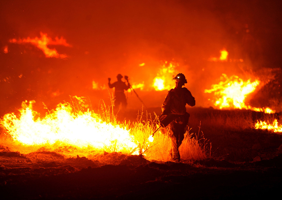 • A firefighter lights a backfire as the Rocky Fire burns near Clearlake, California, on August 3, 2015. The fire has charred more than 60,000 acres and destroyed at least 24 residences.