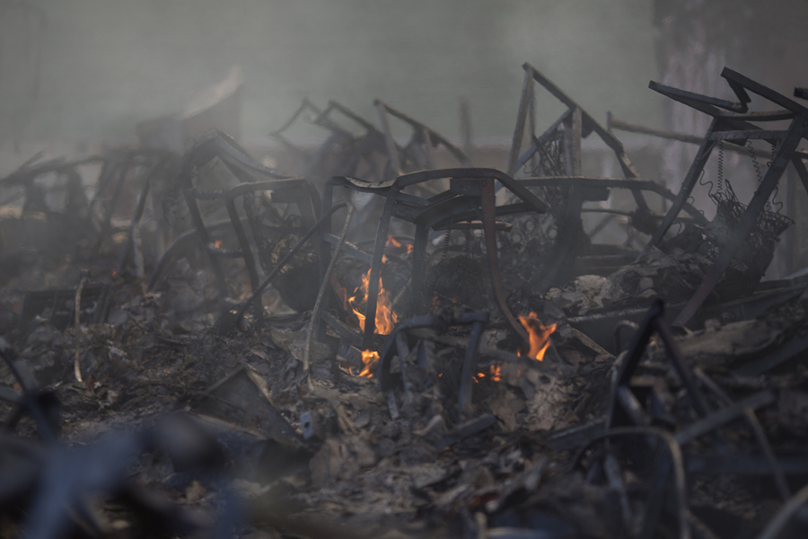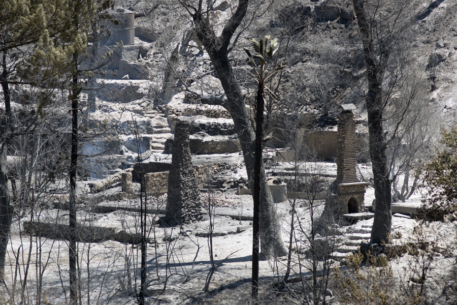 • The ruins of a burned building smolder at the Warm Springs Rehabilitation Center at the Warm Fire on August 16, 2015, in the Angeles National Forest north of Castaic, California.