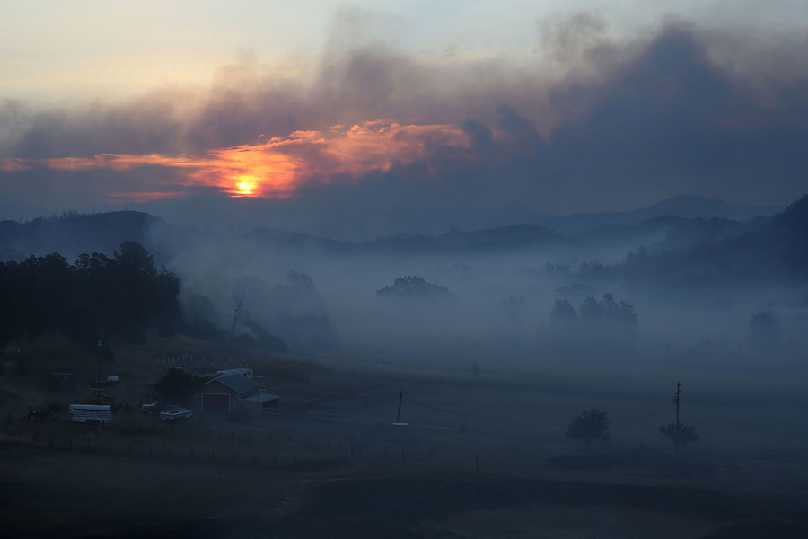 • The sun rises over an area smothered with smoke from the Rocky Fire on July 31, 2015, in Lower Lake, California.