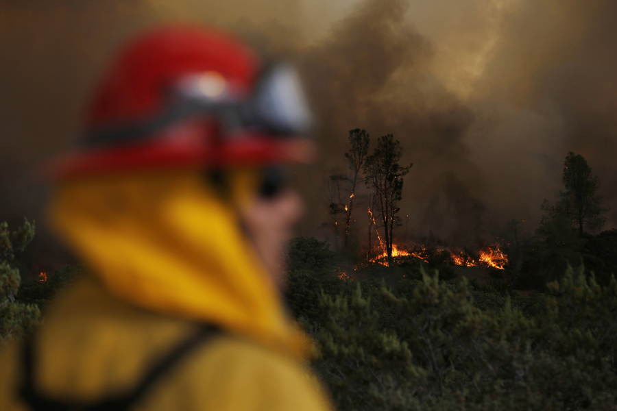 • A Cal Fire firefighter looks on as the Rocky Fire burns through trees on August 2, 2015, near Clearlake, California.
