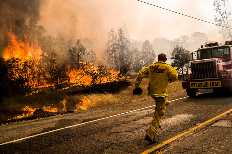 • A Cal Fire firefighter races to move a truck before it’s overrun at the Rocky Fire in Lake County, California, on July 30, 2015.