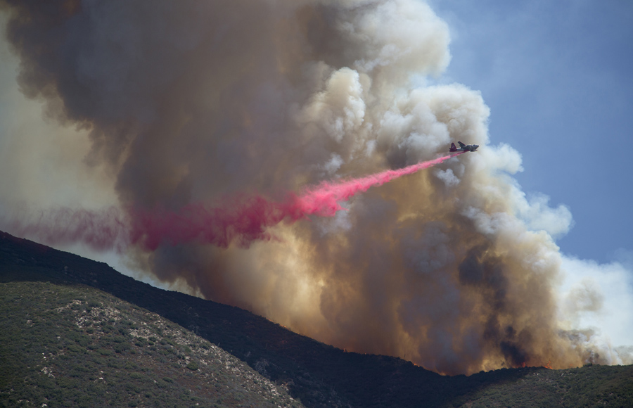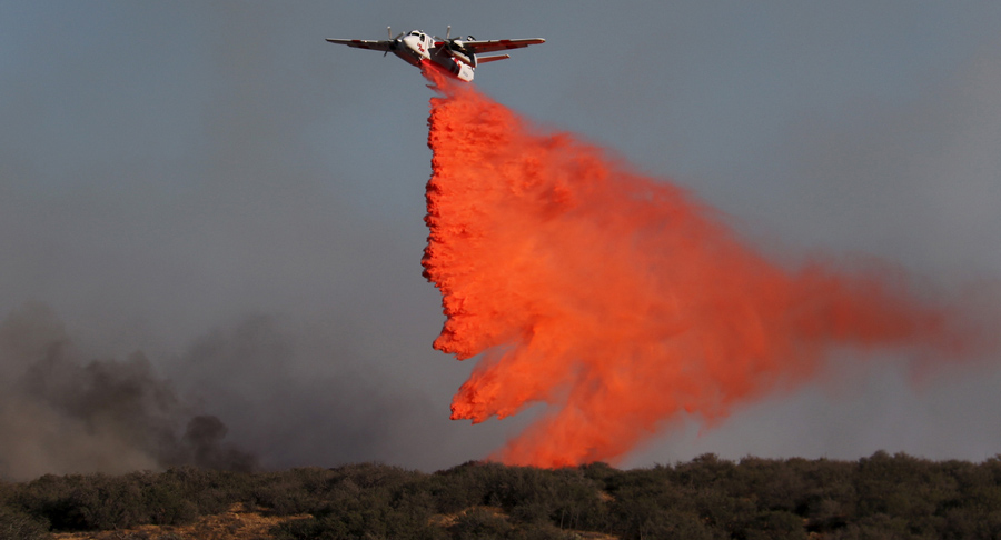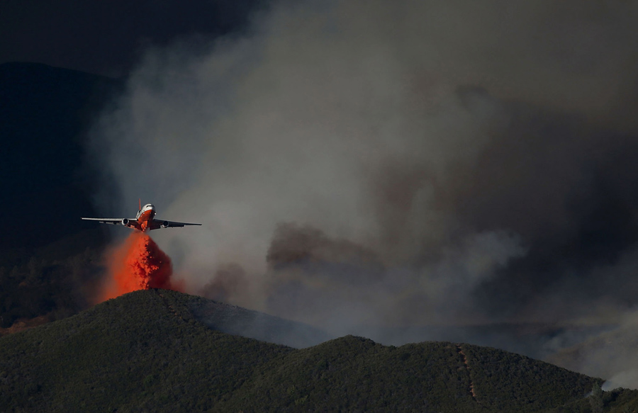 • A firefighter aircraft drops fire retardant at the Cabin Fire in the Angeles National Forest on August 15, 2015, north of Azusa, California.