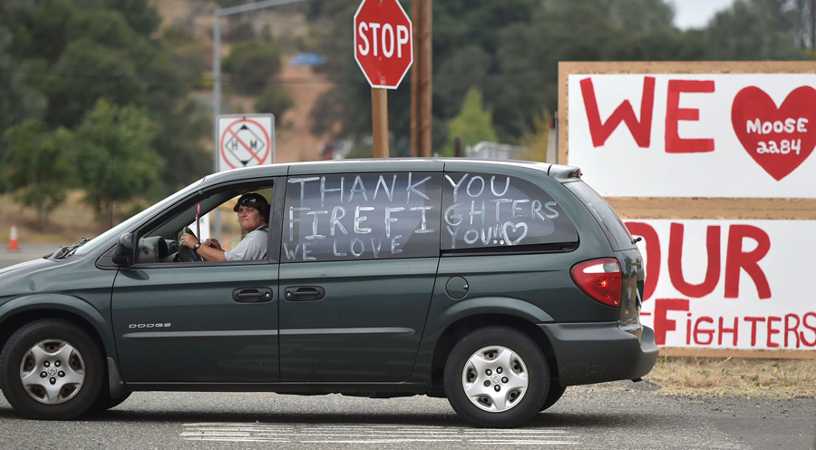 • Diane Beavers drives away from the Moose Lodge in Clearlake Oaks, California, after donating food to evacuees on August 4, 2015.