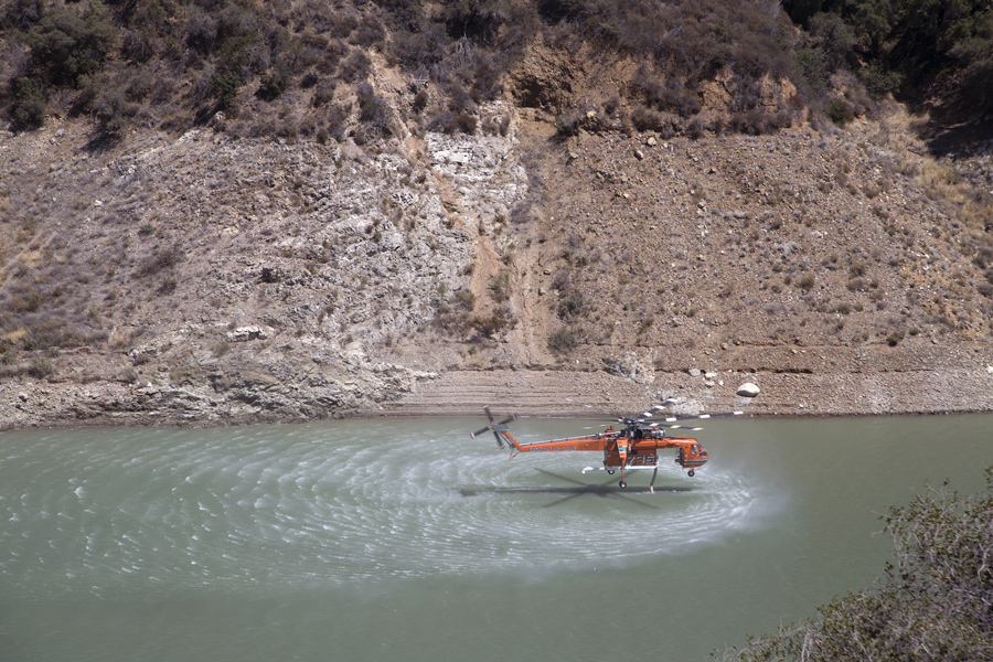 • A firefighting helicopter draws from the lower-than-normal waters of the San Gabriel Reservoir while fighting the Cabin Fire in the Angeles National Forest on August 15, 2015, north of Azusa, California.