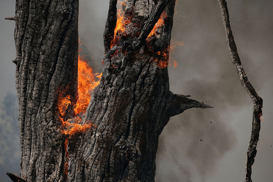 • A charred tree continues to burn after being consumed by the Rocky Fire on August 3, 2015, near Clearlake, California.