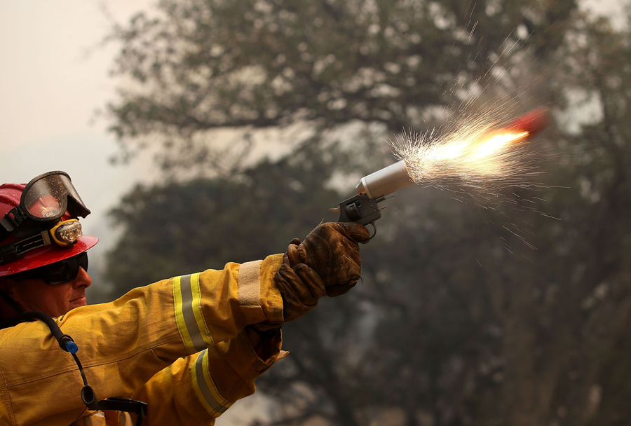 • A Cal Fire firefighter shoots a flare into dry brush during a burn operation to head off the Rocky Fire on August 2, 2015, near Clearlake, California.