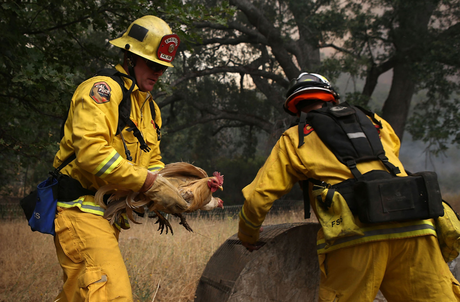 • Cal Fire firefighter Johnny Miller (left) and Cal Fire division chief Nick Schuler move chickens as the Rocky Fire approaches on July 31, 2015, in Lower Lake, California.