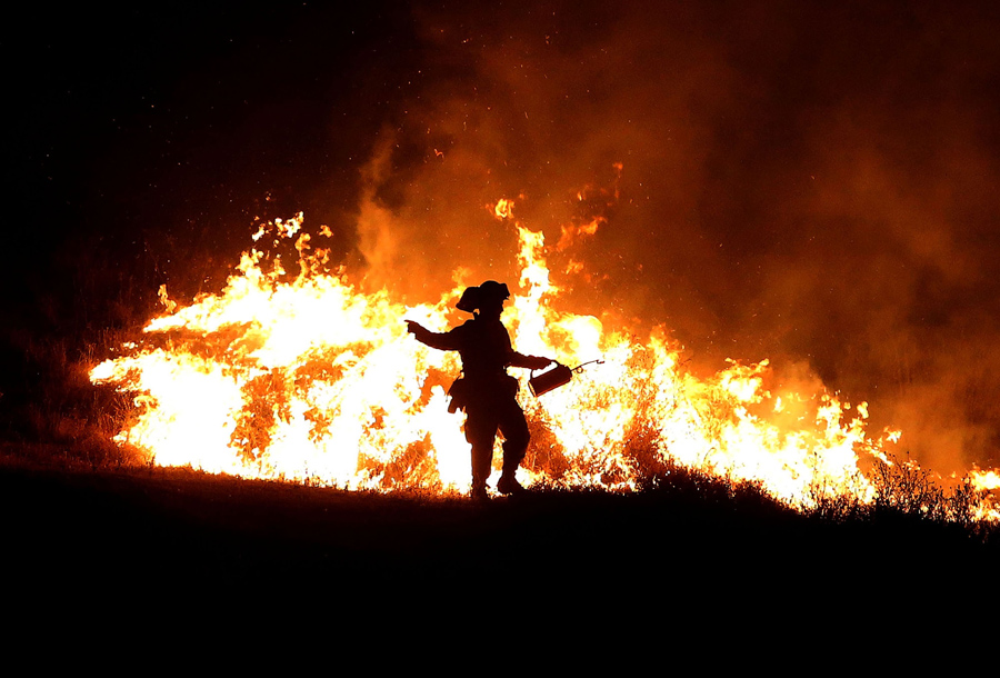 • A Cal Fire firefighter uses a drip torch to start a backfire as he battles the Rocky Fire on August 3, 2015, near Clearlake, California.