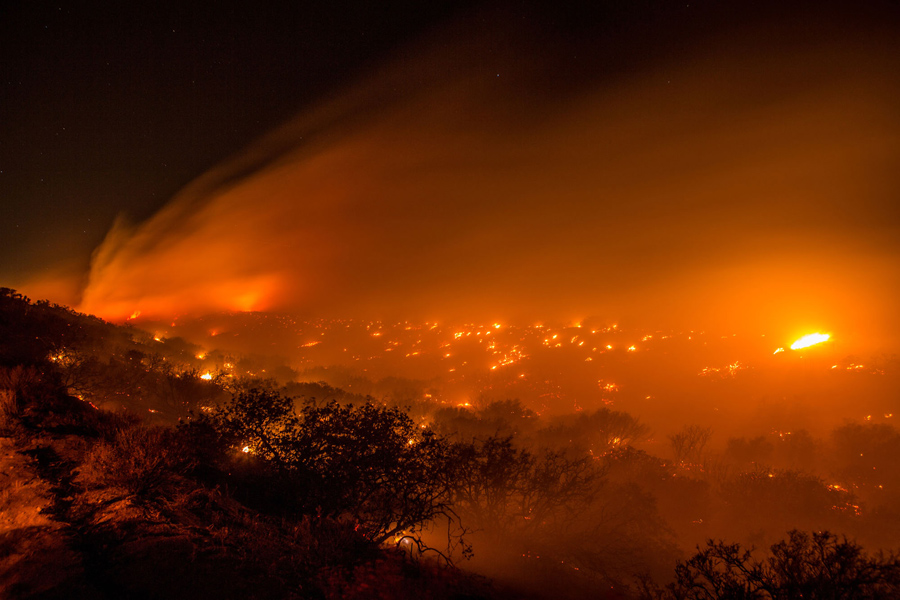 • In this July 17, 2015, photo, the North Fire burns along Baldy Mesa Road near Interstate 15 in the Cajon Pass in San Bernardino County, California. The 5.5-square-mile fire destroyed 20 vehicles on the freeway before burning three homes and 44 more vehicles in the community of Baldy Mesa.