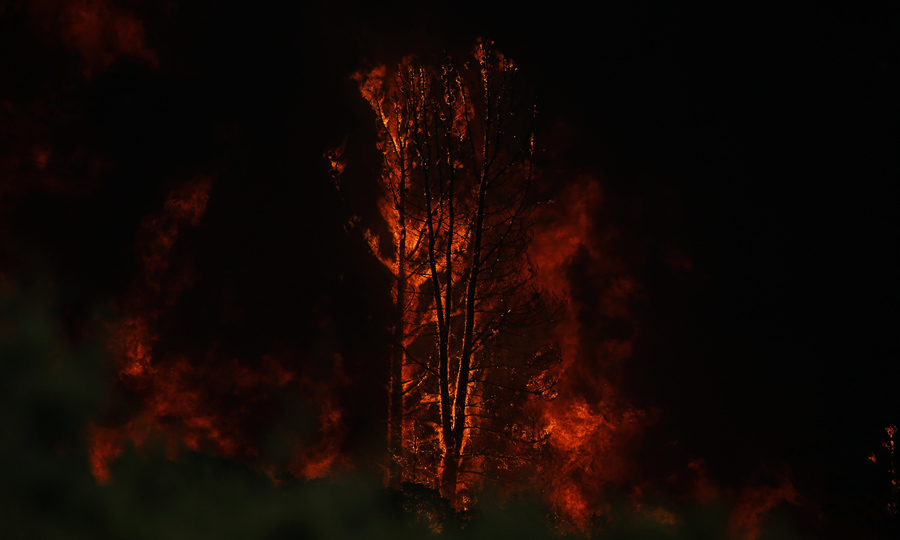 • A tree burns along along Morgan Valley Road during the Jerusalem Fire on August 11, 2015, near Lower Lake, California.