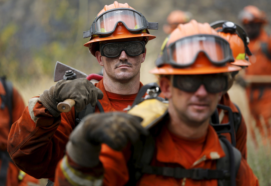 • Inmate firefighters return from setting a fire break along Highway 20 during the Rocky Fire in Lake County, California, on August 4, 2015.