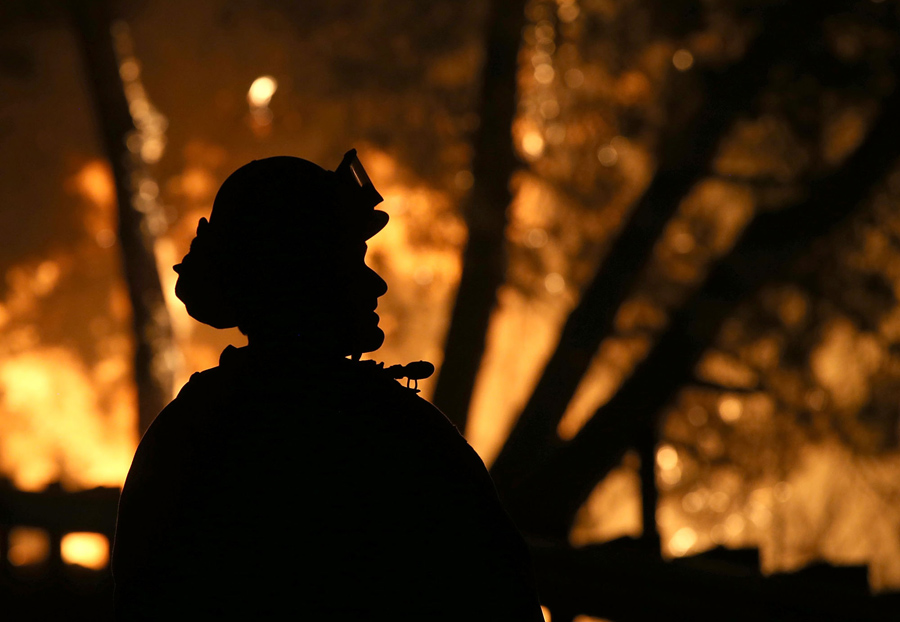 • A firefighter monitors the Jerusalem Fire from Morgan Valley Road on August 11, 2015, near Lower Lake, California.