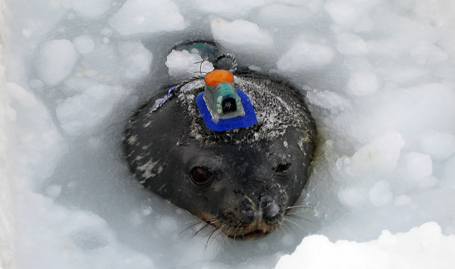 A Weddell seal sports a video data recorder that scientists use to create a three-dimensional map of its movement in the water as it hunts for prey. Researchers hope to learn more about the seals’ hunting behavior during late-winter darkness and how they find their breathing holes in the ice.Randall Davis / National Science Foundation