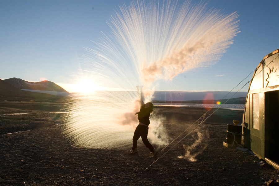 Long-Term Ecological Research field team member Anna Bramucci throws hot water into the air to watch it turn to ice crystals and vapor on a -25 degrees Fahrenheit (-32 degrees Celsius) day at Lake Fryxell field camp in Taylor Valley, Victoria Land, on March 30, 2008.Chris Kannen / National Science Foundation