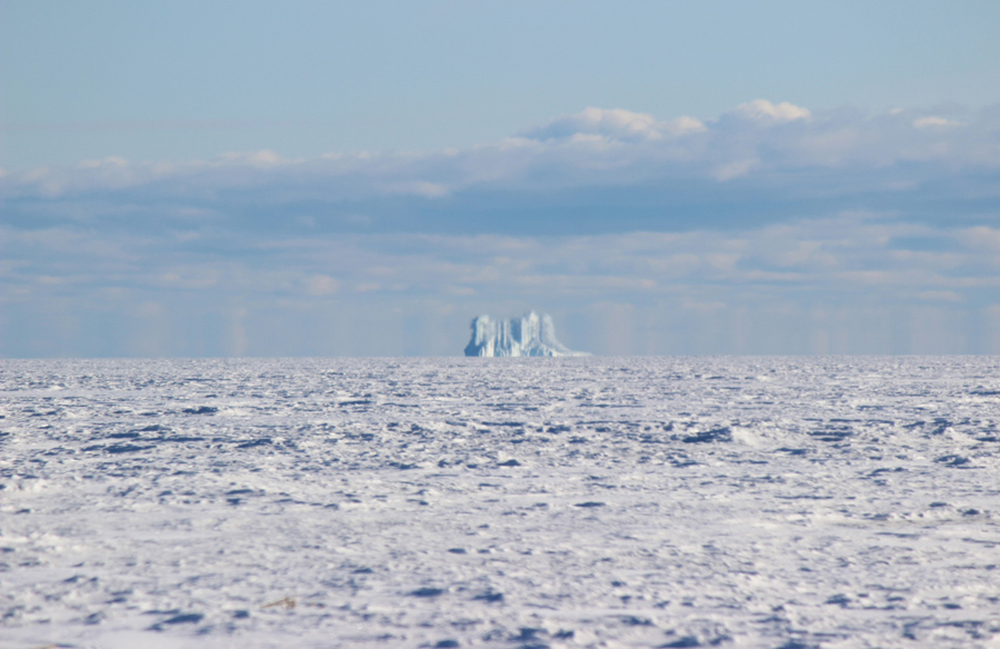 A mirage-like illusion called a fata morgana, usually seen in a narrow band right above the horizon, distorts Ivan the Terra Bus as it approaches Ross Island. The Royal Society Range is in the distance. The green buildings make up Scott Base, a New Zealand research facility. Photographed on November 27, 2012.Reed Scherer / National Science Foundation