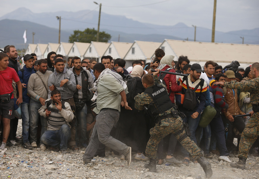 A policer officer hits a man with a baton as he tries to maintain order while migrants wait for trains at a temporary camp near Gevgelija, Macedonia, on September 7, 2015. Several thousand migrants in Macedonia boarded trains to travel north after spending a night in a provisional camp. Macedonia has organized trains twice a day to the north border where migrants cross into Serbia to make their way to Hungary. Since June, Macedonian authorities have said that more than 60,000 migrants—mainly refugees from Serbia—have entered the country, and around 1,500 entered just in one day.Stoyan Nenov / Reuters