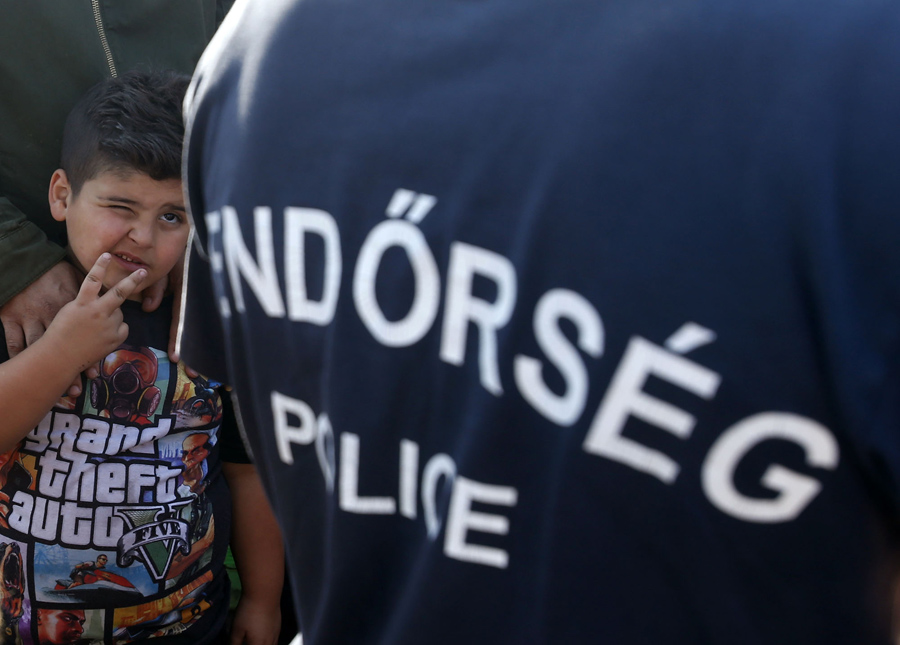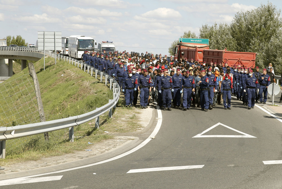 Hungarian police escort migrants back to a collection point in the village of Roszke, Hungary, on September 9, 2015. Hungary closed its M5 highway after groups of migrants broke through a police cordon at Roszke on the border with Serbia on Wednesday and set off on foot towards the motorway, police said on their website.Marko Djurica / Reuters