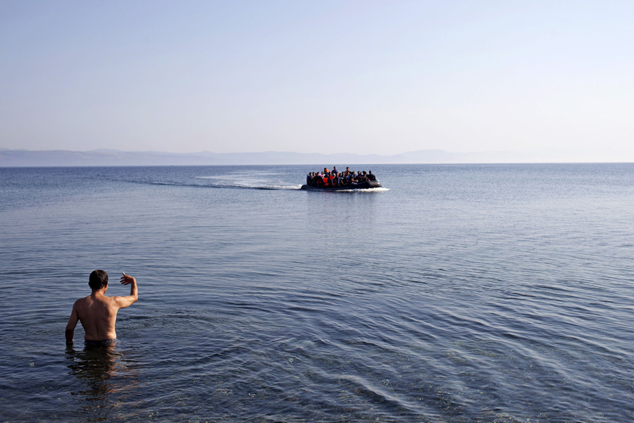 A refugee from Syria prays after arriving on the shores of the Greek island of Lesbos—aboard an inflatable raft across the Aegean Sea from Turkey—on September 7, 2015. Greece sent troops and police reinforcements on September 6 to Lesbos after renewed clashes between police and migrants, according to media reports, while Syrian refugees on the island were targeted with Molotov cocktail attacks. More than 230,000 people have landed on Greek shores this year, and the numbers have soared in recent weeks as people seek to take advantage of the calm summer weather.Angelos Tzortzinis / AFP / Getty
