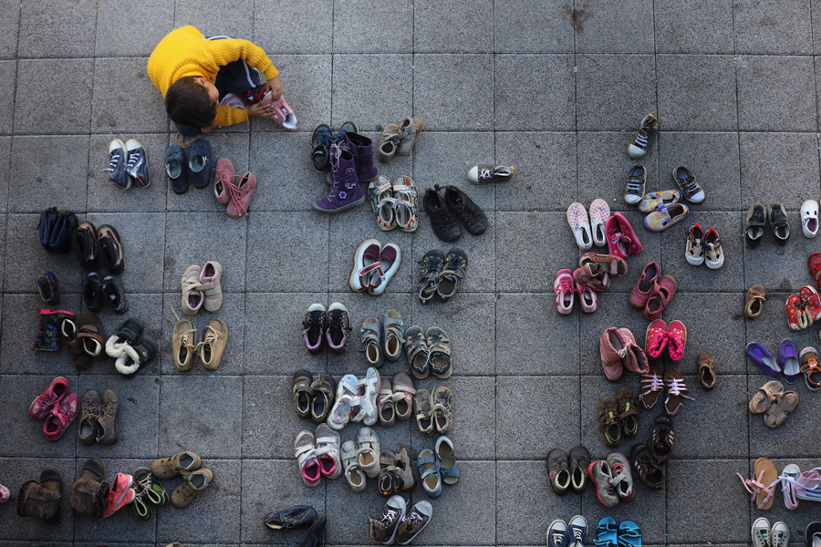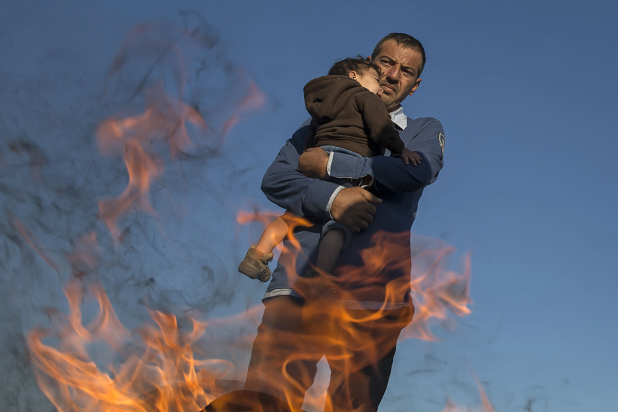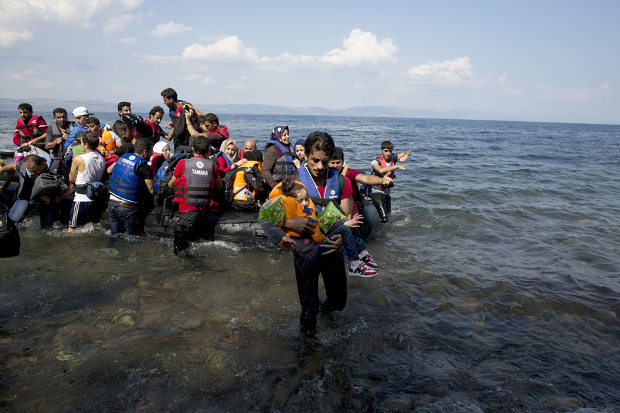 A man carries a child as migrants and refugees arrive on a raft after crossing from Turkey to the island of Lesbos, Greece, on September 8, 2015. The small island has been transformed by the sudden new population of some 20,000 refugees and migrants, mostly from Syria, Iraq, and Afghanistan.Petros Giannakouris / AP