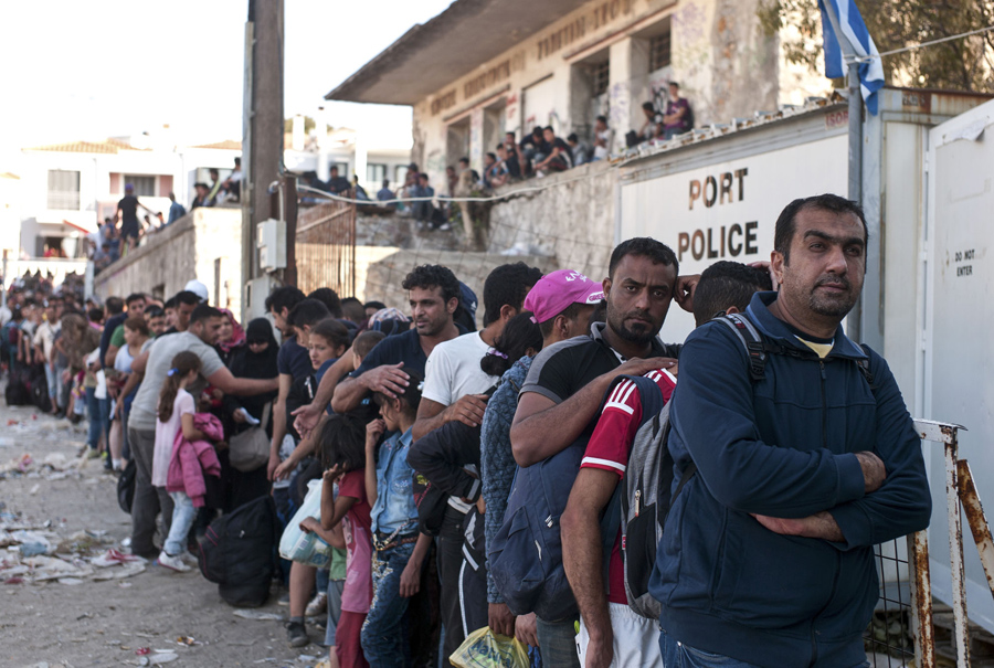 Migrants line up as they wait for a registration procedure at the port of northeastern Greek island of Lesbos on September 5, 2015. Greece’s coast guard says it has rescued hundreds of refugees and migrants from the sea near the eastern Aegean islands. Such rescues are a daily occurrence as thousands flee war and poverty in the Middle East, Africa, and Asia.Angelos Christofilopoulos / AP
