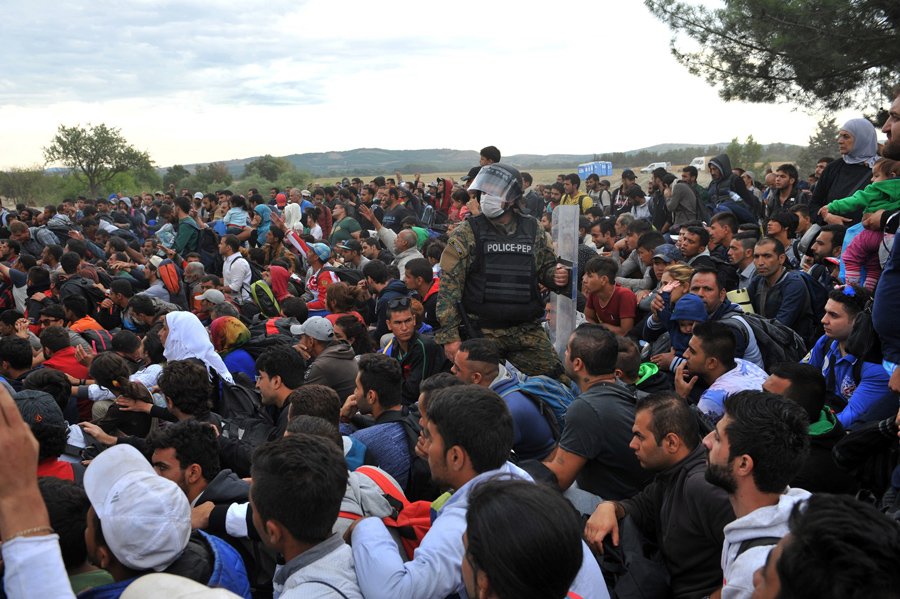 A Macedonian policeman stands amid migrants and refugees who wait to cross the border of Greece and Macedonia near the town of Idomeni, northern Greece, on September 7, 2015.Sakis Mitrolidis / AFP / Getty