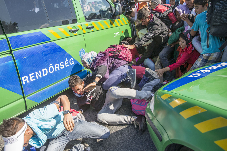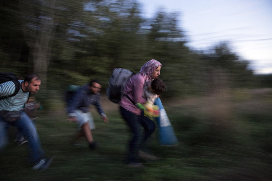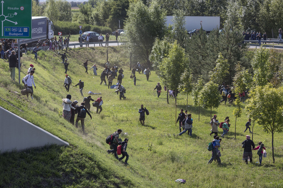 Migrants run across a highway from a collection point that had been set up to transport people to camps on September 9, 2015, in Morahalom, Hungary. People became impatient at the lack of information, facilities, and transport at the collection point and decided to storm past police lines, making their way in all directions.Dan Kitwood / Getty