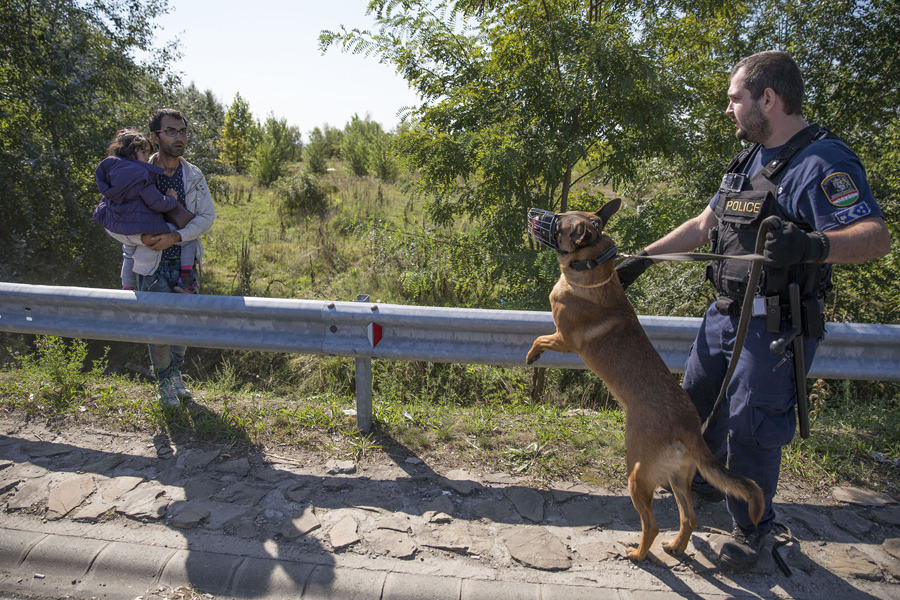 A man is confronted by a Hungarian police officer with a dog as he holds his daughter while migrants run across a highway in Morahalom, Hungary, on September 9, 2015. Since the beginning of 2015, the number of migrants using the so-called “Balkans route” has exploded, with migrants arriving in Greece from Turkey and then traveling on through Macedonia and Serbia before entering the EU via Hungary. The number of people leaving their homes in war-torn countries such as Syria marks the largest migration of people since World War II.Dan Kitwood / Getty