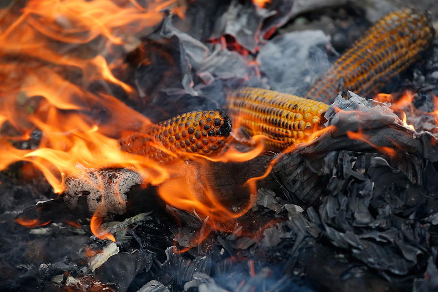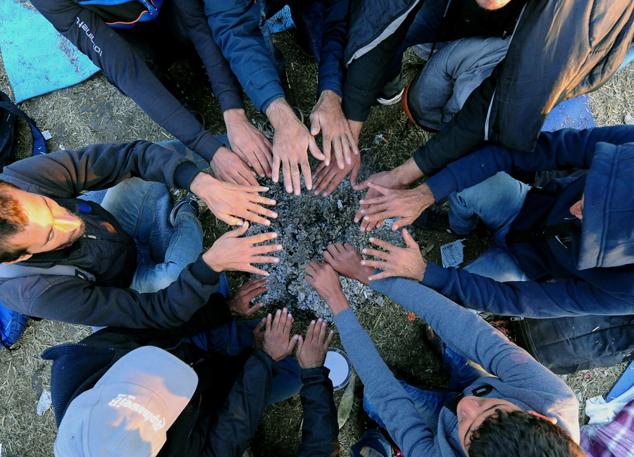 Refugees warm up their hands over hot ash from a bonfire at a migrant collection point near the village of Roszke on the Hungarian-Serbian border on September 8, 2015.Attila Kisbenedek / AFP / Getty
