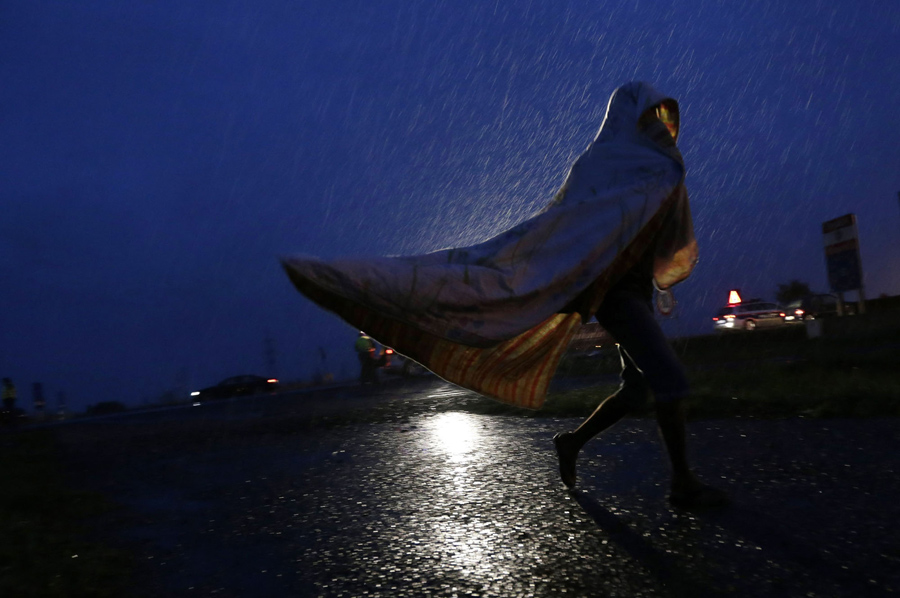 A migrant arrives during heavy rain at the Hungarian-Austrian border in Nickelsdorf, Austria, on September 5, 2015. Migrants came to Nickelsdorf from Budapest as Austria said it and Germany would let them in.Petr David Josek / AP