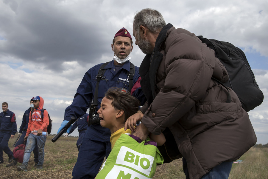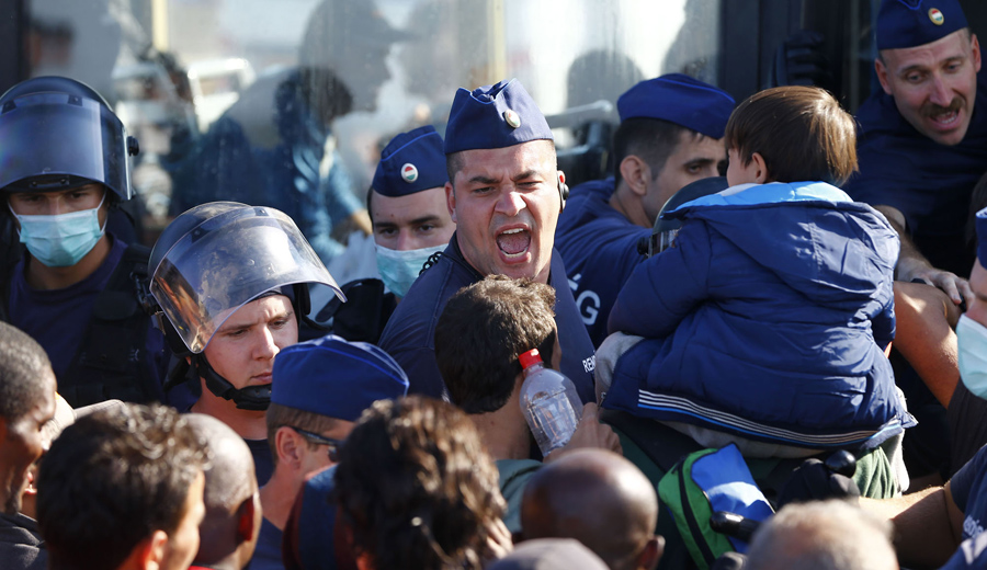(1 of 4) A Hungarian police officer stops migrants as they try to escape in a field near a collection point in the village of Roszke, Hungary, on September 8, 2015.Marko Djurica / Reuters