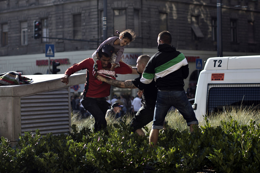 A Syrian man carrying a child (left) scuffles with a Hungarian nationalist in front of the Keleti train station in Budapest, Hungary, on September 4, 2015. Minor skirmishes broke out Friday at the Keleti train station, where hundreds of migrants and refugees are camped.Marko Drobnjakovic / AP