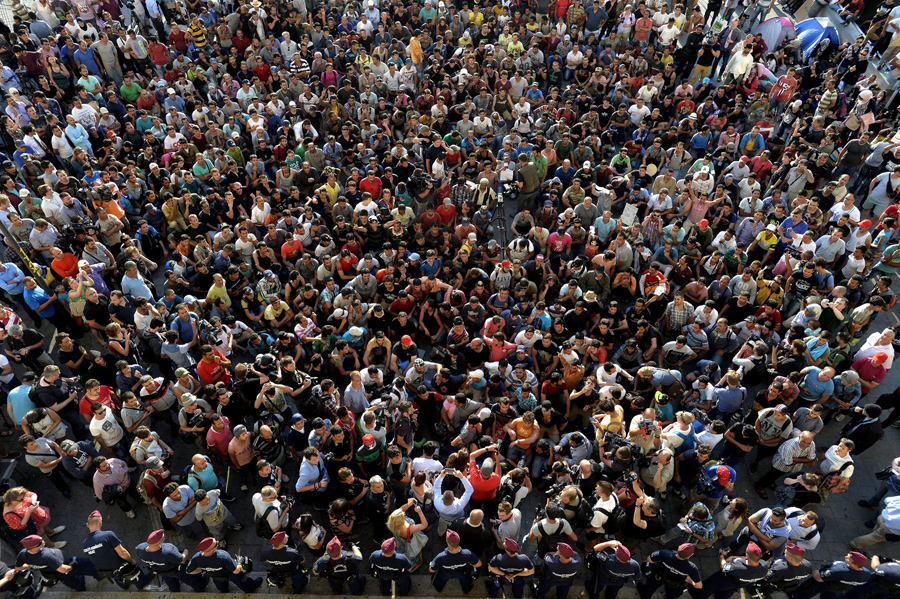 Migrants gather outside the closed Eastern Railway Station in Budapest, Hungary, on September 2, 2015, after they were disallowed from boarding trains bound for Germany.Zoltan Mathe / MTI via AP