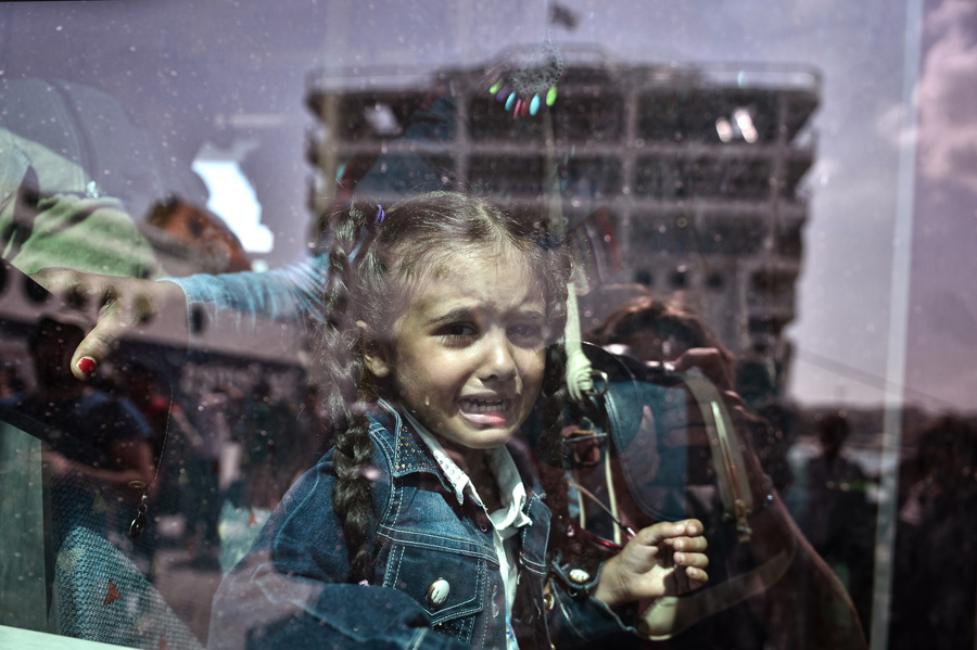 A refugee child cries as she sits on an overcrowded bus transporting refugees and migrants to the metro and train stations, after they disembarked from a government-chartered ferry (reflected in the window) in the port of Piraeus in the Athens area on September 8, 2015.Louisa Gouliamaki / AFP / Getty