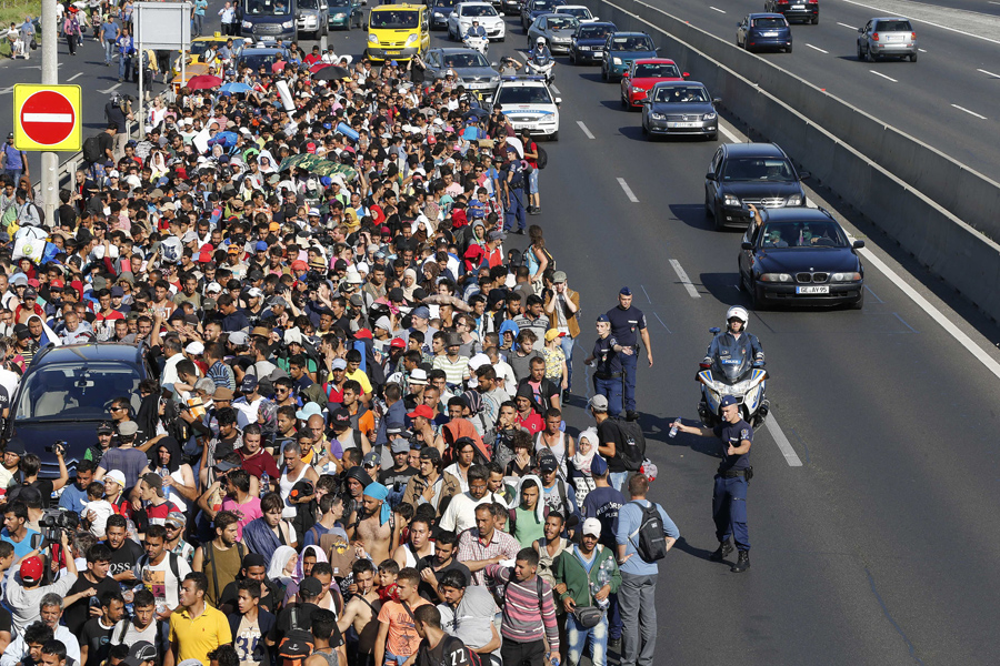 Migrants walk out of Budapest, Hungary, on September 4, 2015. Over 150,000 people seeking to enter Europe have reached Hungary this year, most coming through the southern border with Serbia, and many apply for asylum but quickly try to leave for richer EU countries.Frank Augstein / AP