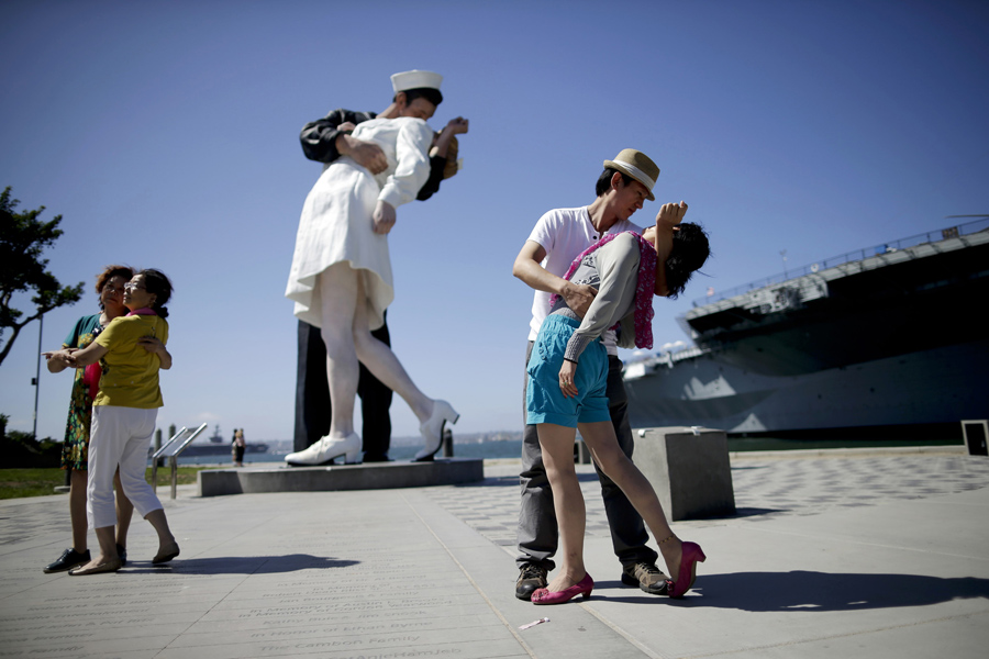 Jie Quan, second from right, of China, dips Juan Wang, also of China, as they pose for family members in front of the sculpture "Unconditional Surrender," on September 18, 2015, in San Diego. The sculpture by Seward Johnson is inspired by Alfred Eisenstaedt's iconic photo of a sailor kissing a nurse in Times Square on V-J Day.Gregory Bull / AP Jie Quan, second from right, of China, dips Juan Wang, also of China, as they pose for family members in front of the sculpture "Unconditional Surrender," on September 18, 2015, in San Diego. The sculpture by Seward Johnson is inspired by Alfred Eisenstaedt's iconic photo of a sailor kissing a nurse in Times Square on V-J Day.Gregory Bull / AP