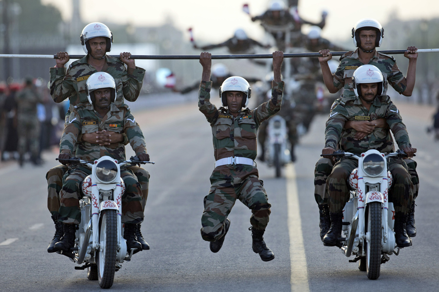 Indian soldiers perform a daredevil motorcycle stunt during a parade to mark the 50th anniversary of the India-Pakistan war of 1965 in New Delhi, India, on September 20, 2015.Tsering Topgyal / AP Indian soldiers perform a daredevil motorcycle stunt during a parade to mark the 50th anniversary of the India-Pakistan war of 1965 in New Delhi, India, on September 20, 2015.Tsering Topgyal / AP