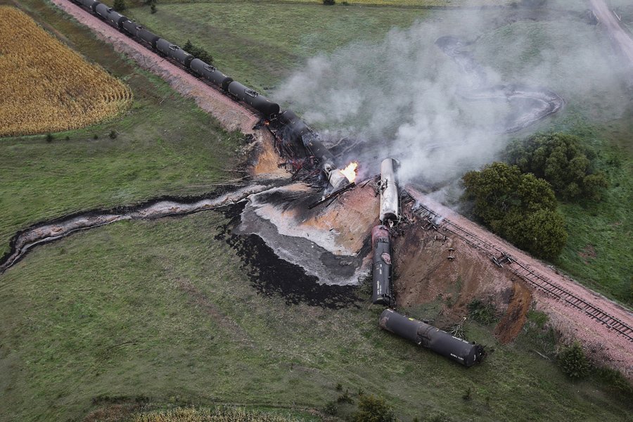 Smoke rises from a burning ethanol tanker car on September 19, 2015, after the 98-car BNSF train derailed in a rural part of Bon Homme County awash in corn fields between the towns of Scotland and Lesterville, South Dakota. Three tankers were compromised and lost their contents. Officials aren't yet sure what caused the derailment over a small bridge that spans a dry creek.Dave Tunge / Dakota Aerials / AP Smoke rises from a burning ethanol tanker car on September 19, 2015, after the 98-car BNSF train derailed in a rural part of Bon Homme County awash in corn fields between the towns of Scotland and Lesterville, South Dakota. Three tankers were compromised and lost their contents. Officials aren't yet sure what caused the derailment over a small bridge that spans a dry creek.Dave Tunge / Dakota Aerials / AP