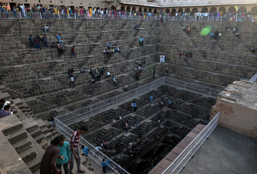 Indian people gather at the historic Chand Baori stepwell in Abhaneri village of western Rajasthan state on September 24, 2015. For a few hours on one day each year, local residents are permitted to descend into the 100-foot-deep, 1,200-year-old stepwell, as Hindu devotees in the area mark a local festival, at the same time as Hindus worldwide observe Ganesh Chaturthi festivities. Chand Baori is one of the oldest and largest stepwells in the world, with some 3,500 steps laid out in a geometric design down to the water at its base.Alex Ogle / AFP / Getty Indian people gather at the historic Chand Baori stepwell in Abhaneri village of western Rajasthan state on September 24, 2015. For a few hours on one day each year, local residents are permitted to descend into the 100-foot-deep, 1,200-year-old stepwell, as Hindu devotees in the area mark a local festival, at the same time as Hindus worldwide observe Ganesh Chaturthi festivities. Chand Baori is one of the oldest and largest stepwells in the world, with some 3,500 steps laid out in a geometric design down to the water at its base.Alex Ogle / AFP / Getty