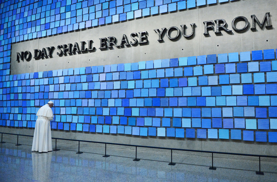 Pope Francis visits the 9/11 Memorial & Museum in New York City on September 25, 2015 and prays at "Trying to Remember the Color of the Sky on That September Morning" by Spencer Finch. Reposed behind this blue wall are the remains of many who perished at the World Trade Center site on September 11, 2001.Susan Watts / Reuters Pope Francis visits the 9/11 Memorial & Museum in New York City on September 25, 2015 and prays at "Trying to Remember the Color of the Sky on That September Morning" by Spencer Finch. Reposed behind this blue wall are the remains of many who perished at the World Trade Center site on September 11, 2001.Susan Watts / Reuters