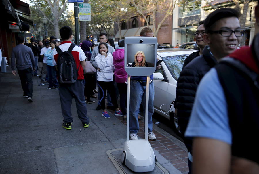 Waiting in line via telepresence, Brianna Lempesis, from San Diego, appears on a video screen on her "Beam" robot, while waiting in line to purchase an iPhone6S at the Apple Retail in Palo Alto, California, on September 25, 2015. Lempesis made the purchase via the screen and the phone was attached to a hook on the robot.Robert Galbraith / Reuters Waiting in line via telepresence, Brianna Lempesis, from San Diego, appears on a video screen on her "Beam" robot, while waiting in line to purchase an iPhone6S at the Apple Retail in Palo Alto, California, on September 25, 2015. Lempesis made the purchase via the screen and the phone was attached to a hook on the robot.Robert Galbraith / Reuters