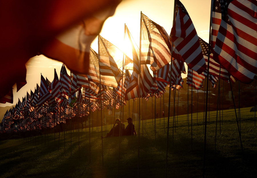 People sit among U.S. national flags, erected by students and staff from Pepperdine University to honor the victims of the September 11, 2001, attacks in New York, at their campus in Malibu, California, on September 10, 2015. The students placed 3,000 flags in the ground in tribute to the nearly 3,000 victims lost in the attacks 14 years ago.Mark Ralston / AFP / Getty