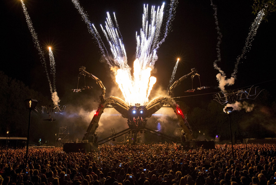 Spectators watch the 50-ton Arcadia Spider perform a laser and pyrotechnics show in Bristol, Britain, on September 4, 2015. Bristol, the European Green Capital 2015, hosted the world’s first recycled-biofuel pyrotechnics show. The Arcadia spider is constructed from used, repurposed military hardware and fueled by waste oil from local fish-and-chips shops.Eddie Keogh / Reuters