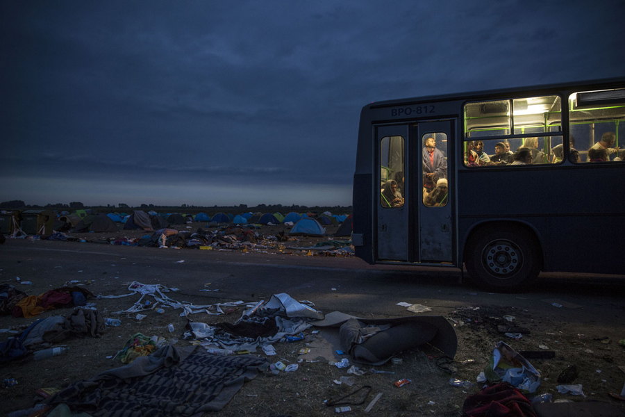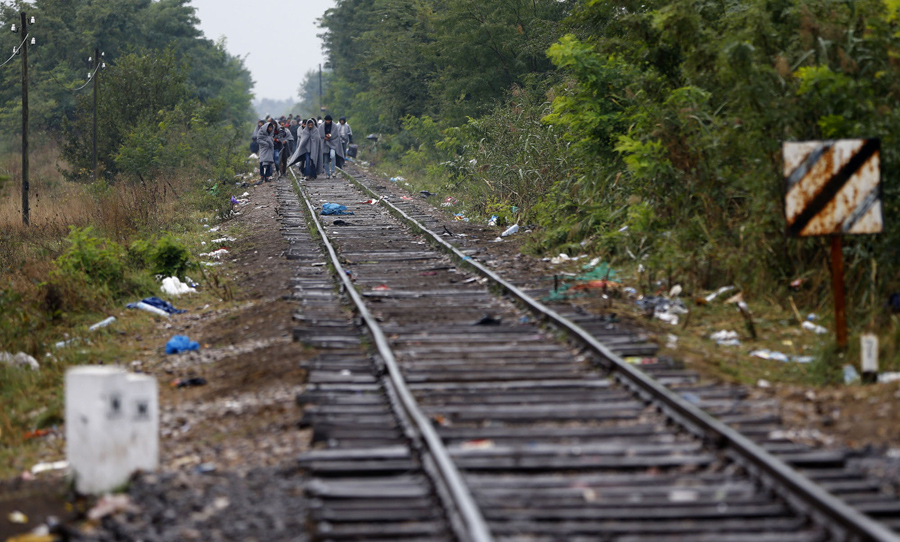 Migrants cross the Serbian-Hungarian border on a railway track near Roszke, Hungary, on September 10, 2015. Leaders of the United Nations refugee agency warned Tuesday that Hungary faces a bigger wave of 42,000 asylum seekers in the next 10 days and will need international help to provide shelter on its border.Matthias Schrader / AP