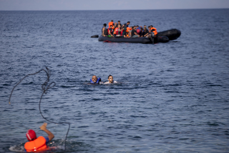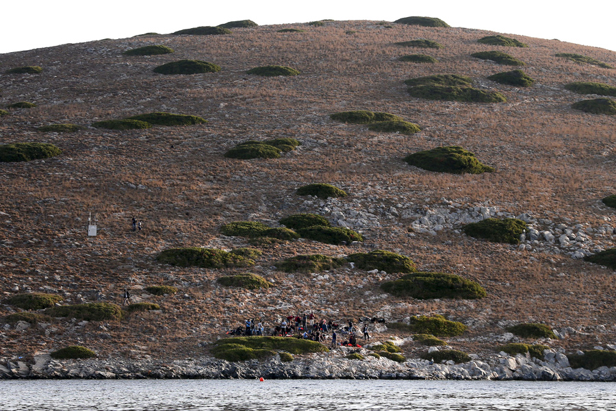 Syrian refugees stand on the shore of the isolated islet of Nera, where they mistakenly landed on a dinghy the previous night, next to the eastern island of Agathonisi, Greece, on September 10, 2015. The refugees, who sailed in the night and landed on Nera after mistaking it for Agathonisi, were stuck on the islet. A local fisherman brought along a dinghy, previously abandoned by others, with him to ferry the migrants to Agathonisi. Agathonisi, a tiny island with fewer than 200 residents, receives about 300 to 600 refugees and migrants every day, local authorities estimate.Alkis Konstantinidis / Reuters