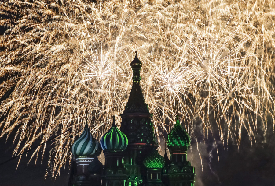 Fireworks explode above St. Basil’s cathedral during the “Spasskaya Tower” international military music festival in Moscow’s Red Square on September 10, 2015.Maxim Shemetov / Reuters
