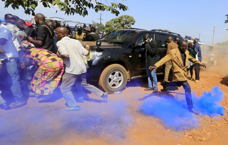 A supporter of Uganda’s former Prime Minister Amama Mbabazi (not pictured) kicks a colored-tear-gas canister fired by police to disperse a gathering in Jinja town in eastern Uganda on September 10, 2015. Police in eastern Uganda fired tear gas and live bullets on Thursday to disperse a campaign rally held by Mbabazi, who is seeking to unseat veteran leader Yoweri Museveni in next year’s elections.James Akena / Reuters