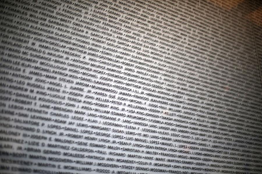 A wall covered with the names of people who lost their lives in the terrorist attacks on September 11, 2001, on display as part of the Flight 93 National Memorial Visitors Center Complex in Shanksville, Pennsylvania, on September 9, 2015. The visitors center was formally dedicated and opened to the public on September 10, 2015.Gene J. Puskar / AP